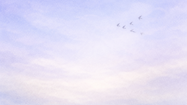 やわらかな春の空のもと、ふと見上げると遠くへと連なって飛んでいく鳥の姿。