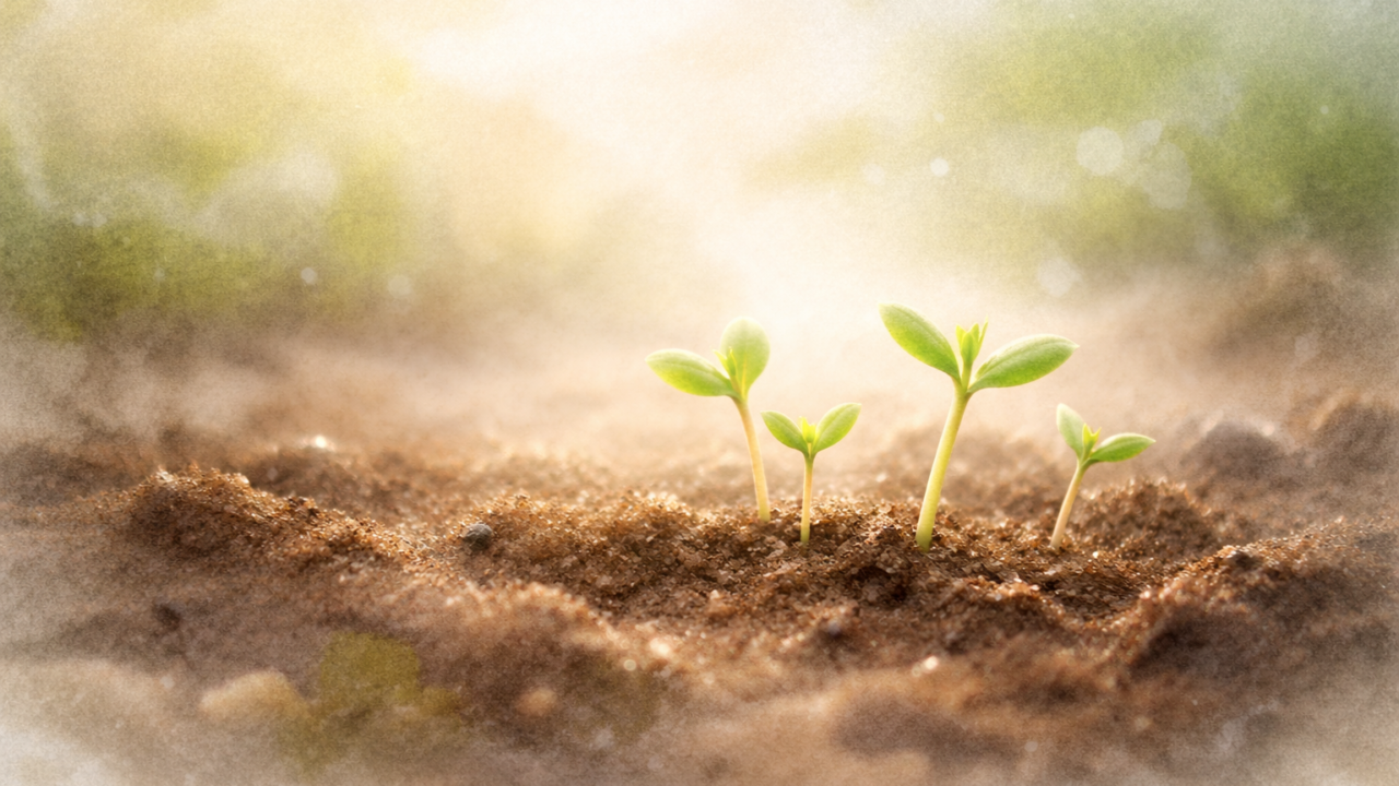 土から顔を出す芽は、まだ細く、やわらかい姿。
