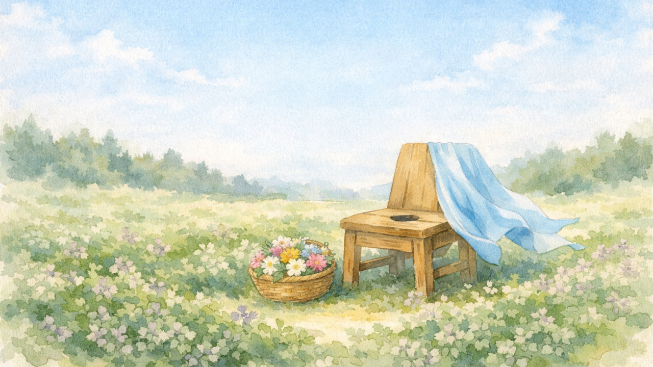 椅子には、青空色のシルクのマントがふわりとかけられ、そのそばには、色とりどりの花が入った丸い籠。